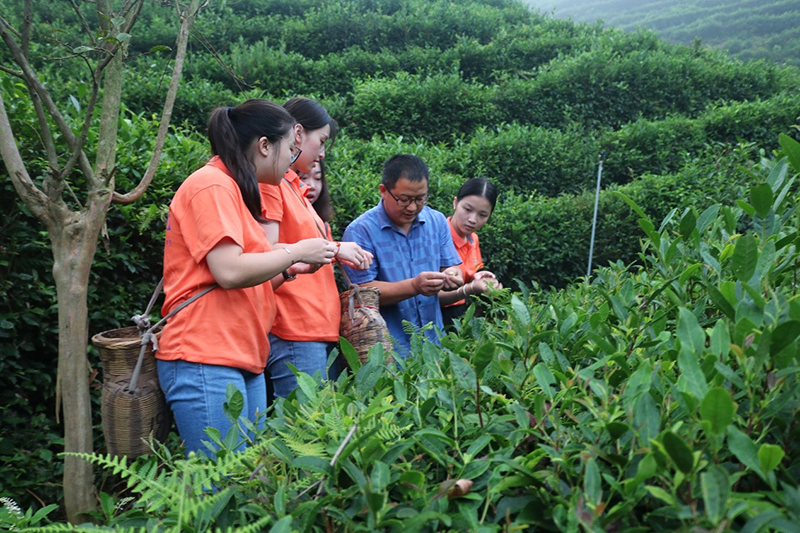 “拂晓闻道探幽微,雪峰采茶品绝伦”,8月17日,9001jcc金沙以诚为本赴洞口县“向阳花”科技支农服务团在茶园负责人米总的带领下,前往湖南古楼雪峰云雾茶有限公司种植基地进行实地考察。到达雪峰山脚时,不由抬头仰望,只见座座茶山笼罩在云雾中,呈现朦胧之美,这便立即明白雪峰云雾茶的由来。